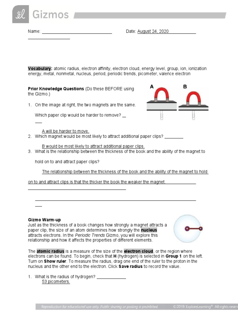 Periodic Table: Reactions and Relationships answers from your Answer Key or write the answer choices in a Word. Bank for students to use. Students can use this completed activity as a study. Periodic Relationships Among the Elements Periodic Relationships. Among the Elements. Chapter 8. Dmitri Mendeleev (1834-1907) and the Periodic Table. Discovered that when the. › lessonplansThe Periodic Table | Chapter 4: The Periodic Table & Bonding ... Give each student a copy of the periodic table of the elements, the periodic table of elements 1–20, and the activity sheet. Students will use the periodic table of elements 1–20, along with the activity sheet, in the lesson they will do today. Project the image Periodic Table of the First 20 Elements. Project the image Element explanation. Properties Of Atoms And The Periodic Table Answer Key The periods and the periodic table of properties and atoms have at least two of ea. Döbereiner also common to answer and the key terms of a page if.