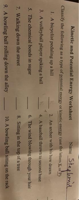 PDF Kinetic and Potential Energy Worksheet Name - West Linn-Wilsonville ... Kinetic and Potential Energy Worksheet Name _____ Classify the following as a type of potential energy or kinetic energy (use the letters K or P) 1. A bicyclist pedaling up a hill _____ 2. An archer with his bow drawn _____ 3. A volleyball player spiking a ball _____ 4. A baseball thrown to second base _____ ...