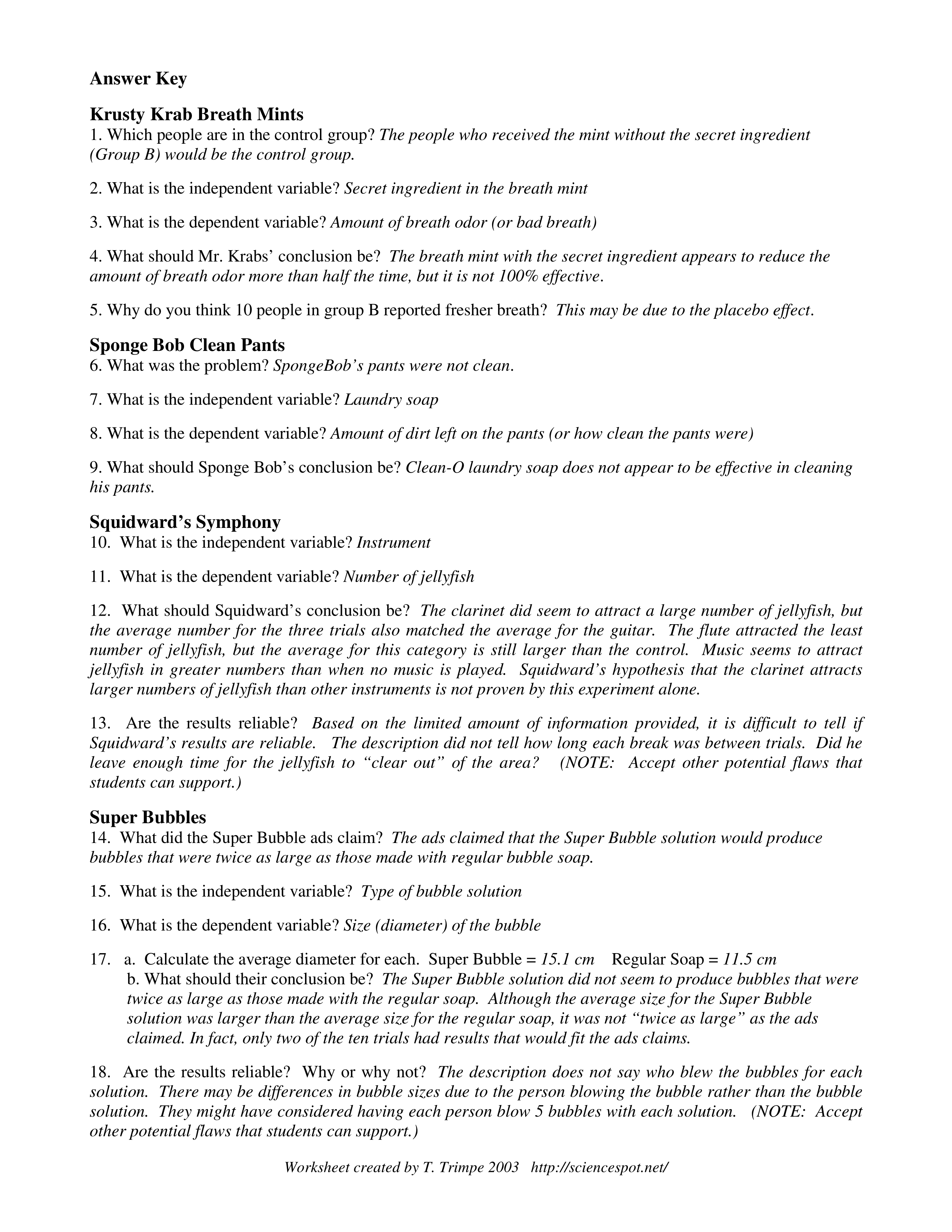 PDF Spongebob Controls And Variables 2 Answers SpongeBob's pants were not clean. 7. What is the independent variable? Laundry soap 8. What is the dependent variable? Amount of dirt left on the pants (or how clean the pants were) 9. What should Sponge Bob's conclusion be? Clean-O laundry soap does not appear to be effective in cleaning his pants. Squidward's Symphony 10. Spongebob Scientific Method Teaching Resources | TPT Scientific Method-SpongeBob Fun Worksheet by The Lesson Pony $1.99 Word Document File Here it is a super fun way to teach your middle school students the scientific method. You will ignite your students' enthusiasm for learning with this engaging worksheet. Perfect for the start of the year or ideal for sub plans Subjects: