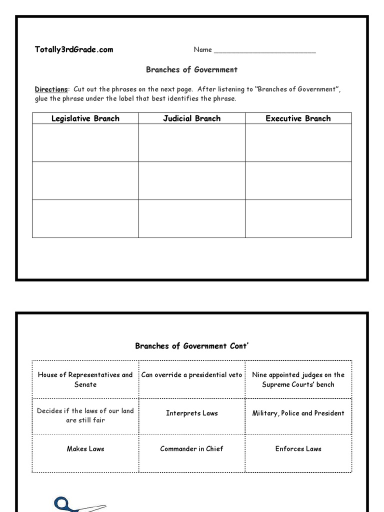 PDF Thematic Unit on Elections: Lesson #1 Grade - eNetLearning three branches of government? 2. Ask the students: "Why do you think it is important for us to understand the role and functions of our three branches of government in the United States?" (Bloom: Analysis) The teacher will need to help the students make a connection between the three branches of government and elections. Step-by-Step Plan: 3. Branches of Government worksheet.pdf - Google Docs The federal government is the national level of government. It is divided into three separate branches: the legislative branch, the judicial branch, and the executive branch. The three branches work together to make sure the power is balanced, and no individual branch becomes too powerful. This is known as a system of checks and balances. Torri Weaver - Three Branches of Government Worksheet student (1).pdf ... Three Branches of Government Three Branches of Government: Legislative, Executive, Judicial Copyright © 2019 The Rittmann Group, LLCInstructions: Label each description below according to the branch of government for which it is describing Article III of the U.S. Constitution outlines the duties and powers of this branch of government3. 4. 3 branches of government cut and paste - TeachersPayTeachers 3 Branches of Government Mini Interactive Lapbook. Digital & Printable by Vilena Hamilton 163 $3.50 PDF Activity Learning works best when it doesn't feel like work.This hands-on fun Interactive Lapbook Project is so much fun! Your students are going to enjoy sorting and matching activities, and doing a little bit of writing.
