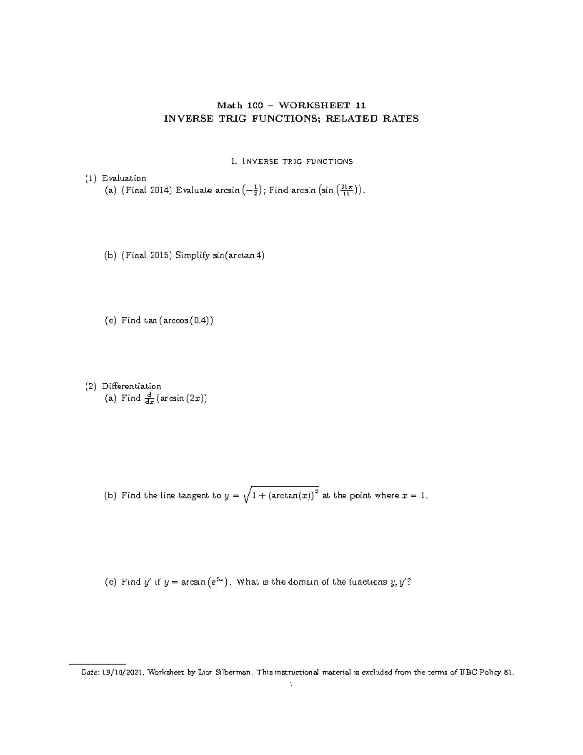 PDF Worksheet 18 KEY - Inverse Trigonometric Functions 4 M110 Fa17 Page 1/7 Worksheet 18 KEY - Inverse Trigonometric Functions (§7.4) 1. arcsin(−1) = − π 2 2. arcsin − √ 3 2! = − π 3 3. arcsin − √