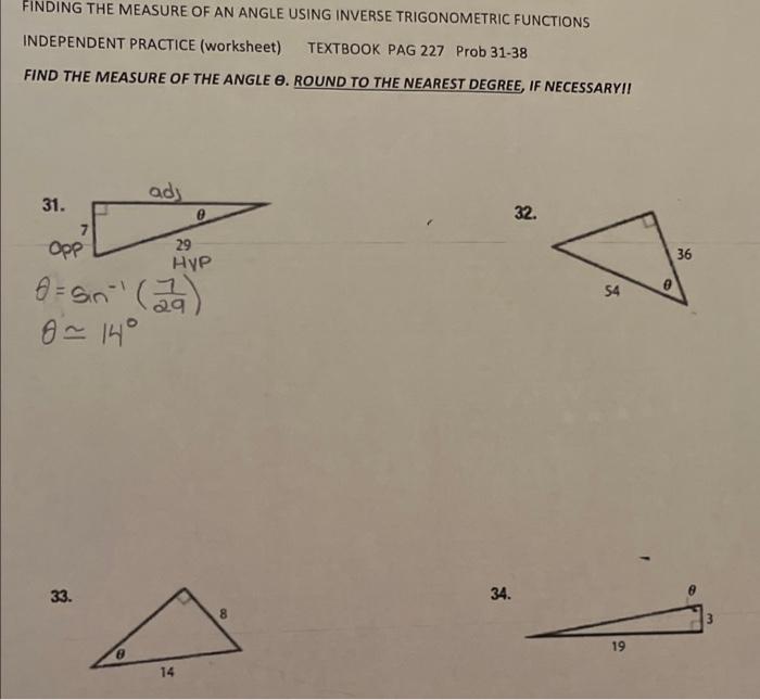 Inverse Trig Functions Worksheet (pdf) and Answer Key Free worksheet(pdf) and answer key on finding angles of right triangles using inverse sine, cosine and tangent. scaffolded questions that start relatively easy and end with some real challenges. ... Students will practice determing angles of right triangles by using inverse trig functions-- arcsine, arc cos, arc tan. Example Questions Other ...