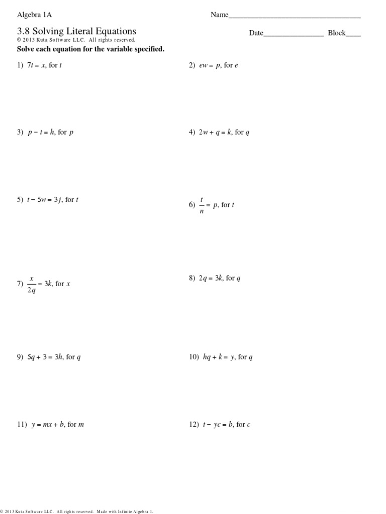 Literal equations worksheet answer
