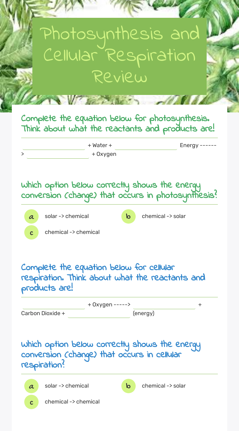 Biology - 2e - Open Textbook Library Biology 2e is designed to cover the scope and sequence requirements of a typical two-semester biology course for science majors. The text provides comprehensive coverage of foundational research and core biology concepts through an evolutionary lens. Biology includes rich features that engage students in scientific inquiry, highlight careers in the biological sciences, and offer everyday ... Cellular Respiration And Photosynthesis Teaching Resources | TpT Photosynthesis and Cellular Respiration Worksheet. by. A-Thom-ic Science. 4.7. (140) $1.35. PDF. This simple worksheet has students review the basics of photosynthesis and cellular respiration and the relationship between the two processes. Answer key included.
