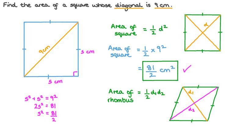 Lesson Worksheet:Finding the Area of a Rhombus Using Diagonals - Nagwa In this worksheet, we will practice finding the area of a rhombus in terms of its diagonal lengths as half the product of these lengths. Q1: The height of a rhombus is 4.1 cm, its base length is 6.6 cm, and the length of one of its diagonals is 4.3 cm. Find, to the nearest tenth, the length of the other diagonal. Q2: