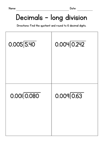Division of decimals by 2-digit decimals | K5 Learning Below are six versions of our grade 6 math worksheet on long division of large decimal numbers by 1 or 2-digit decimals. These worksheets are pdf files. Open PDF. Worksheet #1 Worksheet #2 Worksheet #3 Worksheet #4 Worksheet #5 Worksheet #6. 5 More. Become a Member.