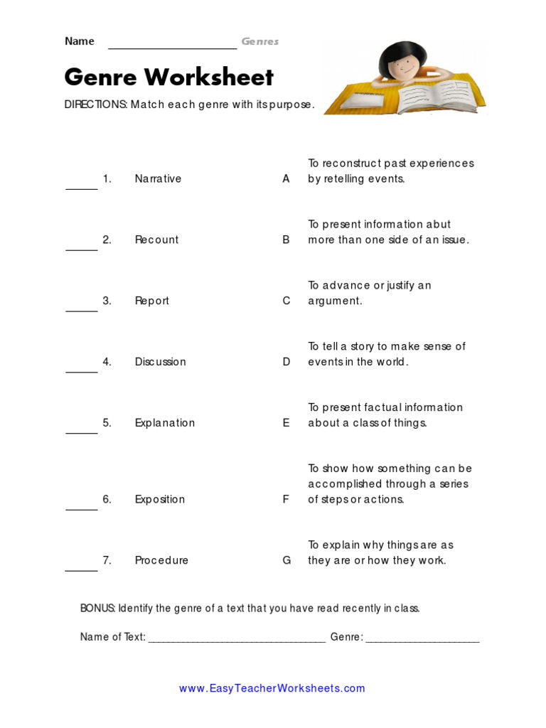 Genre Worksheets | Ereading Worksheets Genre Worksheet 1, Here is a fun worksheet to help students review genre. Read the descriptions of the texts. Look for details in each passage that reveal the genre. Write the genre and subgenre on the lines. Students also explain their answers. Suggested reading level for this text: Grade 6-10. Genre Worksheet 1 Links, Preview, Edit, Print,
