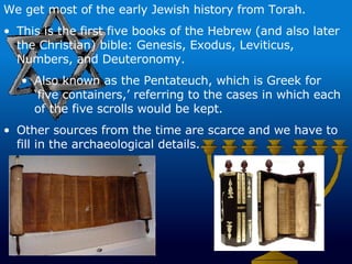PDF People and Ideas on the Move Section 4 The Origins of Judaism the early history of the Israelites comes from the Torah, the sacred book of the Jewish people. The story of the Israelites began in Mesopotamia. There, according to the Torah, God chose a man named Abraham to be the "father," or the first of the Jewish people. God told Abraham to move his family to Canaan. Abraham promised that