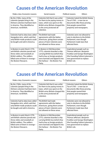 Causes of the american revolution worksheet answers. Join LiveJournal Password requirements: 6 to 30 characters long; ASCII characters only (characters found on a standard US keyboard); must contain at least 4 different symbols; Assignment Essays - Best Custom Writing Services Get 24⁄7 customer support help when you place a homework help service order with us. We will guide you on how to place your essay help, proofreading and editing your draft – fixing the grammar, spelling, or formatting of your paper easily and cheaply. The American Revolution: Causes - Ducksters Below are some of the key causes of the American Revolution in the order they occurred. The Founding of the Colonies One thing to keep in mind is that many of the American colonies were first founded by people trying to escape religious persecution in England. As the British government became more involved in the affairs of colonies, people ... What Does It Mean to Think Historically? | Perspectives on ... Jan 01, 2007 · The core insight of contingency is that the world is a magnificently interconnected place. Change a single prior condition, and any historical outcome could have turned out differently. Lee could have won at Gettysburg, Gore might have won in Florida, China might have inaugurated the world's first industrial revolution.