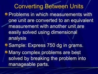 PDF 3.3 Conversion Problems - Henry County Schools 80 Chapter 3 3.3 FOCUS Objectives 3.3.1 Construct conversion factors from equivalent measurements. 3.3.2 Apply the technique of dimen-sional analysis to a variety of conversion problems. 3.3.3 Solve problems by breaking the solution into steps. 3.3.4 Convert complex units, using dimensional analysis. Guide for Reading Build Vocabulary