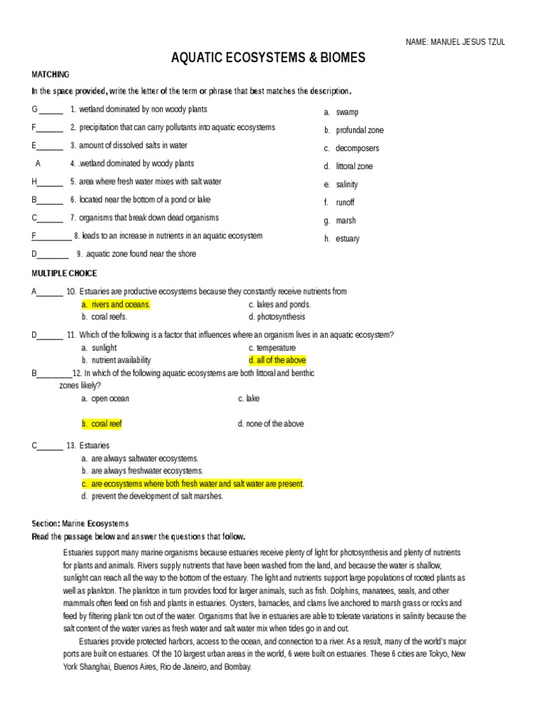 Aquatic Ecosystem And Biomes Worksheet Answers This worksheet is the perfect way for helping your students learn and review Biomes, Habitats, and Ecosystems.This worksheet is designed with the following learning objectives: Define biome and habitat. Identify the factors that define terrestrial biomes and aquatic biomes. Describe the characteristics of the major biomes of the world.In this ...