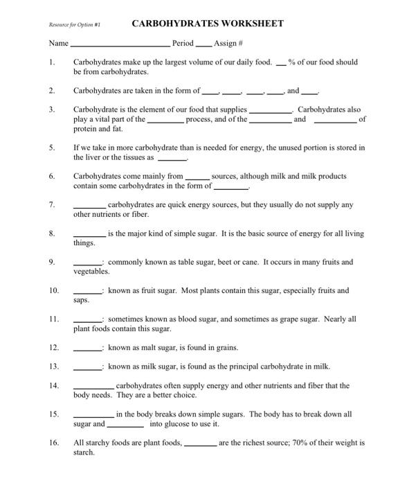Chemistry of carbohydrates worksheet answers. Carbohydrates Worksheet Answers Flashcards - Quizlet Study with Quizlet and memorize flashcards containing terms like Glucose, Polysaccharide, Glycogen and more. Carbohydrates Worksheet Are these monomers or polymers? b. What characteristics determines which monosaccharide it is? c. The three monosaccharides below have the same chemical formula ... Basic Chemistry & Biochemistry Unit Review What are the monomers of carbs.?_monosaccharides. 6. 5. What is the function of carbs.? 7. Key. Biochemistry Review Worksheet. Directions: Answer the ... Carbohydrate Worksheet Answer Key - blaw 2001 - StuDocu carbohydrate for the course of biology 1. It includes the structure of glucose ... carbohydrate worksheet answer key what is the monomer for carbohydrates?