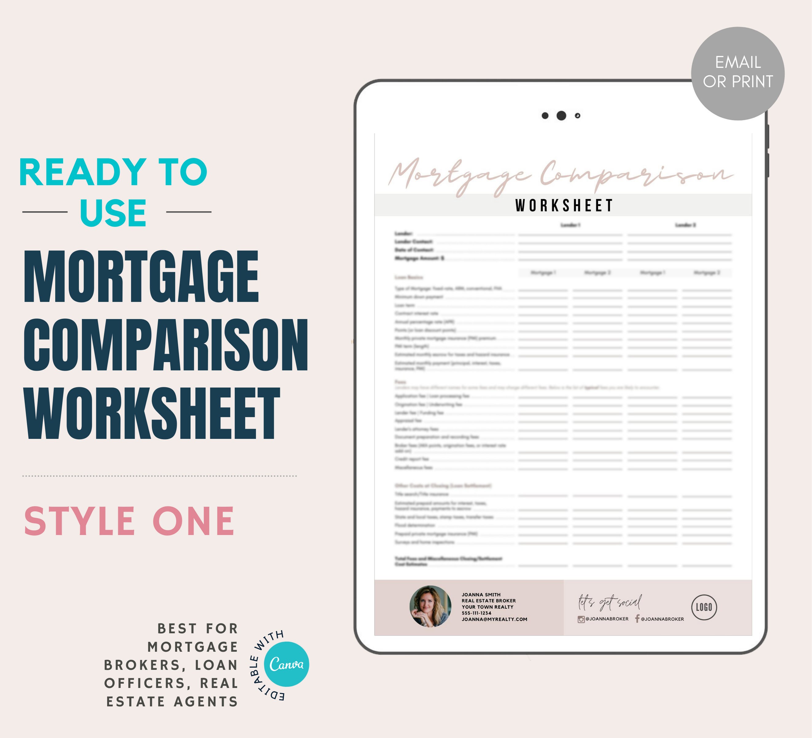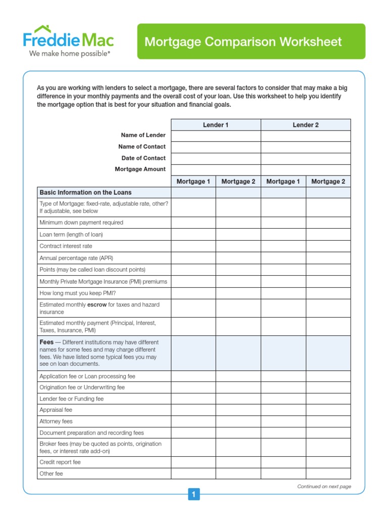 PDF Mortgage Comparison Worksheet - Freddie Mac Mortgage Comparison Worksheet As you are working with lenders to select a mortgage, there are several factors to consider that may make a big difference in your monthly payments and the overall cost of your loan. Use this worksheet to help you identify the mortgage option that is best for your situation and financial goals. Lender 1 Lender 2