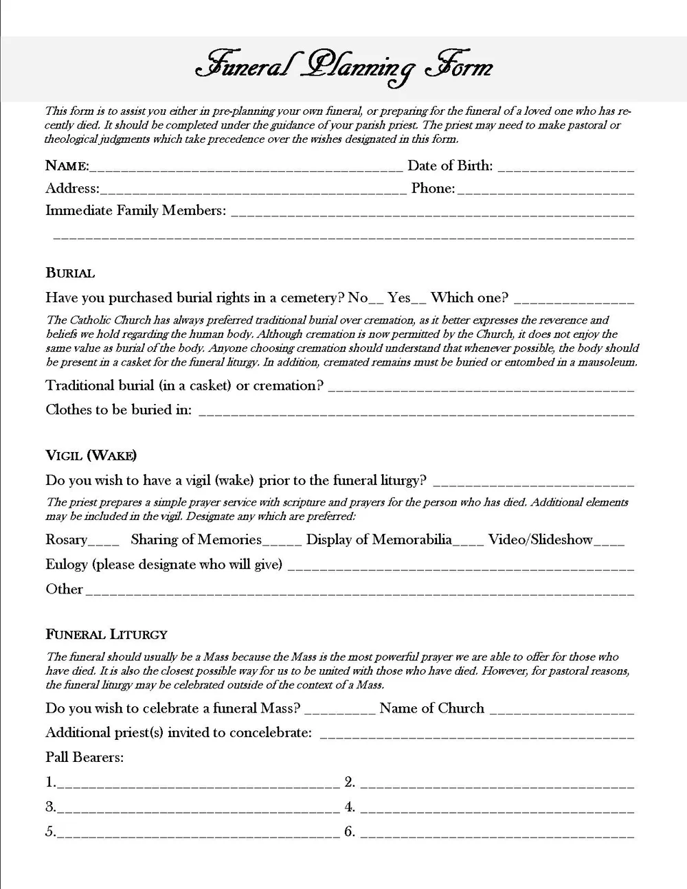 Catholic Funeral Mass planning template - LiturgyTools.net Catholic Funeral Mass planning template This is an order-of-service planning template for the Funeral Mass - the longest part of a Catholic funeral service. The worksheet has one line for each item that typically occurs in a funeral Mass liturgy, and space to record the details: what readings and hymns, who is doing them, what key the music is in.