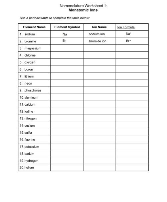 PDF Nomenclature Worksheet 1: Monatomic Ions - Honors Chemistry Nomenclature Worksheet 1: Monatomic Ions Use a periodic table to complete the table below: Element Name Element Symbol Ion Name Ion Formula 1. sodium 2. bromine 3. magnesium 4. chlorine 5. oxygen 6. boron 7. lithium 8. neon 9. phosphorus 10. aluminum 11. calcium 12. iodine ...