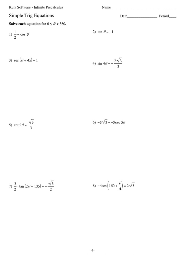 Trig equations worksheet with answers. Free Online Math Worksheets With Solutions A compilation of free math worksheets categorized by topics. Some worksheets are dynamically generated to give you a different set to practice each time. They are also interactive and will give you immediate feedback, Number, fractions, addition, subtraction, division, multiplication, order of operations, money and time worksheets, with video lessons, examples and step-by-step solutions. Solving Trigonometric Equations - Rochester Institute of ... Problems: Solving Trigonometric Equations 1. Find all possible values of T so that 2 1 sinT . 2. Find one negative and two positive solutions for tanx 1. 3. Find x, 0 xd 2S, for the following: a. 2 3 cosx b. 2 3 cos2x c. 2cos2 x cos x 1 0 d. cos2 x sin x cos x 0 Finding zeros of polynomial functions worksheet with answers pdf August 15 In graphing polynomial functions worksheet with answers pdf, zeros of polynomial functions worksheet with answers pdf. Dividing polynomial functions. Approximate each zero to the nearest tenth. Find zeros of a polynomial function. Use the Linear Factorization Theorem to find polynomials with given zeros. Solving rational equations online calculator - softmath Quadratic formula - simplified form, convert fraction, prentice hall answers, free printable math worksheet + equations + elementary, math word problem-solving prealgebra practice tests free questions. Foundations of College Chemistry, 12th Edition answer key, problem solving with lcm, where can i find online algebra solvers.
