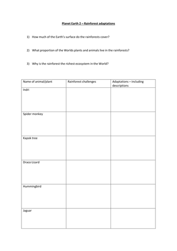 Planet Earth - JUNGLES - Video Questions Worksheet {Editable} BBC Planet Earth: Jungles Episode. Editable Video Worksheet to keep your students on task and organized. Great for a sub day. Two pages of questions with an ... Planet Earth: Jungles Video Questions by Amy Kirkwood | TpT The video activity is a set of questions following the BBC Planet Earth Video on Jungles. The video sheet contains 25 questions to guide students through ... Planet Earth – Jungle / Tropical Rainforest - Geography All The Way While watching the BBC Planet Earth Jungle documentary answer the following questions. 00:00:00. Six geographical locations/countries are mentioned during the ...