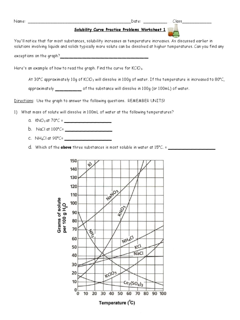 allinonehighschool.com › chemistry-with-lab-2018Chemistry with Lab – Easy Peasy All-in-One High School Check the video answers in the “Quiz me” questions at the bottom of page 3. Lesson 121. Review your notes and answer the self-assessment and practice on page 3. Use your notes if you need to. Go to page 5 and begin the rock candy lab on solubility. The material will have to sit for a few days. SOLUBILITY CURVE WORKSHEET Use your solubility curve graph provided to answer the following questions. 1. What are the customary units of solubility on solubility curves? ______. 2. solubility curves Worksheet: Solubility Graphs. Use the provided solubility graph to answer the following questions: Sclubitry (g of salt in 100 g H₂0).