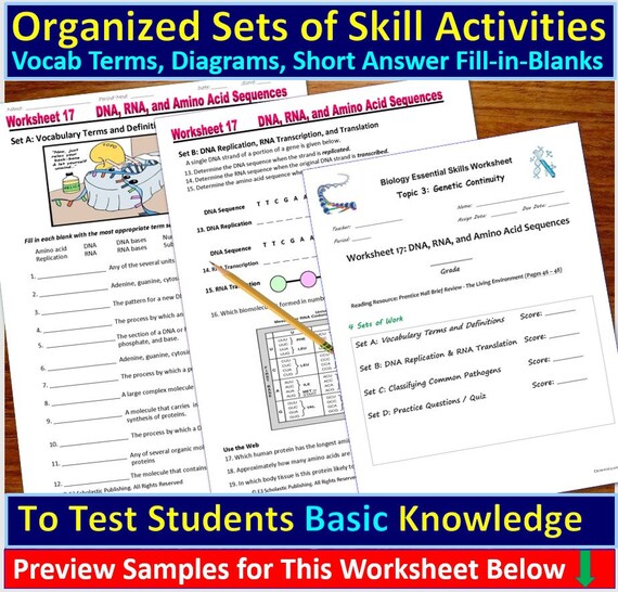 Dna rna and replication worksheet answer key. The Science Spot DNA Keychains (PPT) - A Power Point presentation to use as students make the keychains and includes an answer key for the DNA Replication activity listed below. DNA Replication (pdf)- Explore the replication process using the student-made keychains. The worksheet also introduces the process of protein synthesis. | DNA and RNA Basics: Replication, Transcription, and Translation 22.06.2021 · DNA (deoxyribonucleic acid) is one of the most important molecules in your body, and though around 99.9% of your DNA is the same as that of every other human, the 0.1% that’s different is what makes you genetically unique!This tiny biological structure is the ultimate instruction manual, containing the “recipes” for the proteins your body needs to develop and … DNA vs RNA - Similarities and Differences - Science Notes and … 23.08.2020 · Differences Between DNA and RNA. DNA and RNA are different from each other in several ways. DNA uses the sugar deoxyribose, while RNA uses the sugar ribose. The difference between deoxyribose and ribose is that deoxyribose has a hydrogen (-H) attached to the second (2′) carbon of the sugar ring, while ribose has a hydroxyl group (-OH ... 11.2 DNA Replication - Microbiology | OpenStax Matthew Meselson (1930–) and Franklin Stahl (1929–) devised an experiment in 1958 to test which of these models correctly represents DNA replication (Figure 11.5).They grew E. coli for several generations in a medium containing a “heavy” isotope of nitrogen (15 N) that was incorporated into nitrogenous bases and, eventually, into the DNA. This labeled the parental …