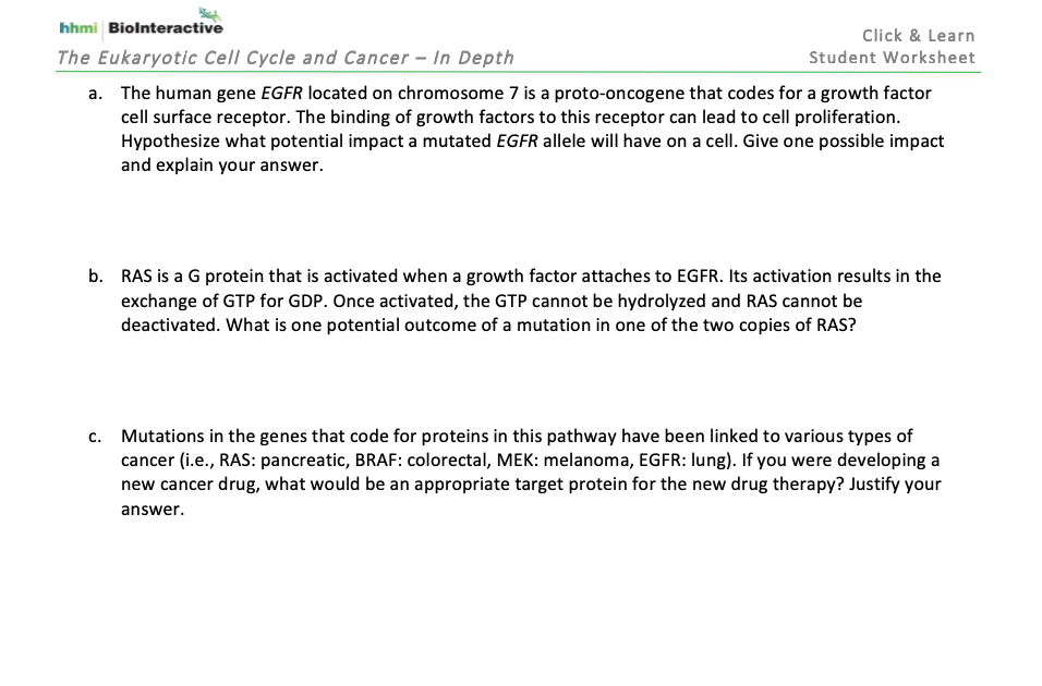 The p53 gene and cancer student worksheet answers. The p53 Gene and Cancer - HHMI BioInteractive Student Learning Targets Describe the structure-function relationship of each of p53's domains. Explain how the expression and function of p53 is regulated in the cell. Explain how a mutated version of the p53 gene can lead to cancer. Curriculum Connections Materials Resource Google Folder (link) Overview Worksheet (PDF) 297 KB Classifying Cancer Genes and Examining Patient Data - HHMI BioInteractive Description. These two hands-on activities engage students in exploring the genetic basis of cancer using cards and posters. After watching a short video and completing a worksheet, students can do one or both of the following activities. In "Activity 1," students identify where genes involved in cancer are located on human chromosomes ... p53 Worksheet Overview Final | PDF | P53 | Transcription Factor p53. In turn, p53 activates genes that stop cell growth or even trigger the cell to die. Low oxygen concentration, DNA damage, Chemotherapeutic agents, as well as other stress can activate 4. To understand how the p53 protein works, you need to understand its structure. In your own words, describe the function of each of p53's domains (slide 4). a. PDF Student HandoutClick and Learn The p53 Gene and Cancer Advanced Student HandoutClick and Learn The p53 Gene and Cancer Advanced 10. What are the two roles of Mdm2 (slide 6)? 11. Watch the video clip on slide 6 and answer the following questions: a. What is the purpose of ubiquitin? b. What is the role of the proteasome? 12. Hypothesize how Mdm2 "tags" p53 for degradation. 13. Read slide 7 and watch the ...
