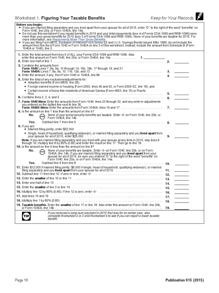 Social Security Benefits Worksheet—Lines 20a and 20b 2015 Form 1040—Lines 20a and 20b Social Security Benefits Worksheet—Lines 20a and 20b Before you begin: 2. 3. 4. 5. 6. 7. Complete Form 1040, lines 21 and 23 through 32, if they apply to you. Figure any write-in adjustments to be entered on the dotted line next to line 36 (see the instructions for