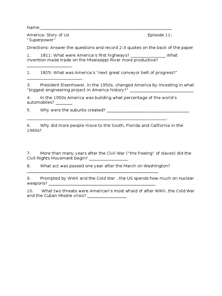 America the story of us worksheet answers. America The Story Of Us Boom Worksheet Pdf Answers An america the story of us worksheet is a great tool for helping children understand the point of view of the soldiers and civilians during the civil war. Answer the questions while watching the film to the best of your ability. America The Story Of Us Rebels Worksheet Pdf Answers - Printable Worksheet Template. America: The Story of US - Episode 9: Bust Worksheet & Google Doc America The Story of US. America The Story of Us is an epic 12-hour television event that tells the extraordinary story of how America was invented. With highly realistic CGI animation, dramatic recreations and thoughtful insights from some of America's most respected artists, business leaders, acad America The Story Of Us Episode 9 Bust Answers - Learny Kids Displaying top 8 worksheets found for - America The Story Of Us Episode 9 Bust Answers. Some of the worksheets for this concept are Terms to know episode 9 bust introduction, America the story of us, Terms to know episode 7 cities introduction, Southampton union school district home, America story of us millennium, America the story of us boom directions, Canada the story of us teacher guide ... The History Channel America: The Story of US Episode #3-Westward Directions: Fill in the blanks below. This is a quick paced worksheet: questions will be answered fast throughout the video.