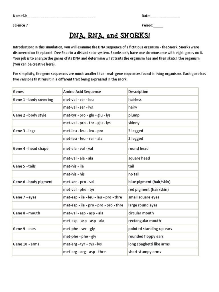 DNA, RNA, and Snorks Teacher Guide - The Biology Corner Answer key for a simulation showing alien RNA, match the RNA codon to its amino acid and use a code to sketch the organism according to traits such as, number of legs, shape of the head, color, etc... DNA, RNA, and Snorks Teacher Guide Original Document: DNA, RNA, and Snorks. This activity can become tedious if you assign all of the snorks. ...