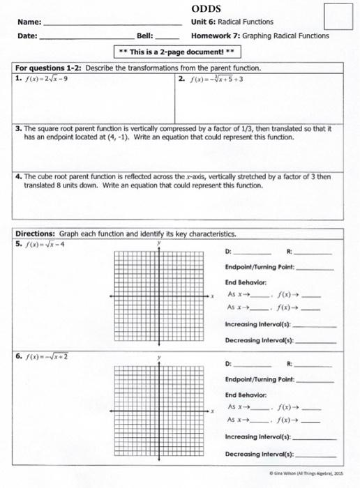 Graphing Linear Functions Printable Math Worksheets Answers Answers to graphing grids worksheets are available in pdf format. These worksheets are a good way to practice comparing and relating coordinate pairs. Graphing worksheets usually have a single and a four-quadrant grid. Each point is connected with the previous point by a line segment. Graphing Square Root Functions Worksheet Name Period Date Graphing ... Graphing Square Root Functions Worksheet Name Period Date Graphing is a free printable for you. This printable was uploaded at October 13, 2022 by tamble in Functions. Graph Square Root Functions Worksheet - If you're looking for graphing functions worksheets, you've come to the right place. {There are several different types of graphing ... Graph - Carlisle Area School District Practice Worksheet: Graphing Square Root Functions Final corrections due: Graph each square root function and describe its characteristics. 1] =2√ −2−4 Endpoint: Guide point using a: y-intercept: Extra guide point: (6, _____) Domain: Range: 2] =−3√ +6 Endpoint: Guide point using a: y-intercept: