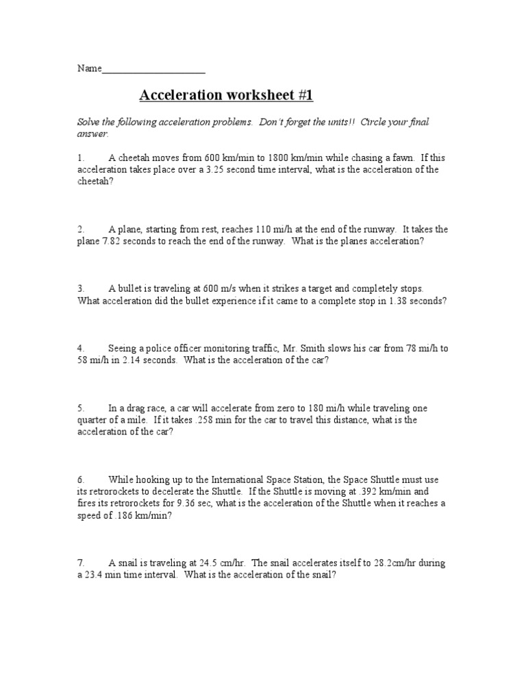 Acceleration Practice Problems Worksheet Answers Speed, Velocity And Acceleration Calculations Worksheet S. Part 3 - Acceleration Calculations: For problems 11- 13 use the acceleration formula to solve the following problems. Show your work (formula, numbers with correct units and answer with correct units). a = (Final Velocity - Initial Velocity) / Time = (v f - v o) / t 11. Achiever Papers - We help students improve their academic ... We have writers who are well trained and experienced in different writing and referencing formats. Are you having problems with citing sources? Achiever Papers is here to help you with citations and referencing. Our professional writers are experienced in all formatting styles such as APA, MLA, Chicago, Turabian, and others. force and acceleration worksheet acceleration science physical worksheet velocity worksheets middle answers calculation speed graphs grade 8th calculating force dec published fabtemplatez using math. Acceleration problems worksheet answer key. Force and acceleration worksheet answers — db-excel.com. Using the formula fma force mass acceleration 2nd law