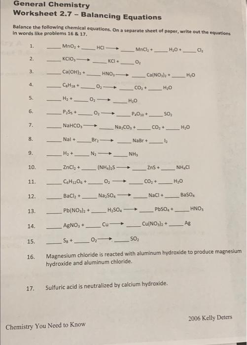 Chemistry Worksheet Writing Chemical Equations Answer Key Online Library Balancing Chemical Equations Worksheet 1 Answer Key Word Equations Write the word equations below as chemical equa- tions and balance: 1) Zinc and lead (II) nitrate react to form zinc nitrate and lead. 2) Aluminum bromide and chlorine gas react to form aluminum chloride and bromine gas.
