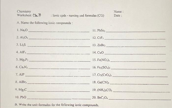 Chemistry worksheet on naming and writing compounds. Naming Ionic Compounds Worksheet Pdf With Answers An example is ammonium ion, nh 4 +. Solutions for the naming ionic compounds practice worksheet 1) ammonium chloride 2) iron (iii) nitrate 3) titanium (iii) bromide 4) copper (i) phosphide 5) tin (iv) selenide 6) gallium arsenide 7) lead (iv) sulfate 8) beryllium bicarbonate 9). These worksheets cover chemical names and formulas. Chemistry In Biology Worksheet Answers - Chemistryworksheet.com Chemistry worksheets include a molecule nomenclature section that covers the elements, compounds, and formulae. Some worksheets even cover the naming ionic compounds. This worksheet is a great way to start learning chemistry. You can also use it to review what you have already learned. Naming Ionic Compounds Worksheet Pdf With Answers Naming Ionic Compounds Worksheet Pdf With Solutions. 1) nabr sodium bromide 2) cao calcium oxide 3) li 2 s lithium sulfide 4) mgbr 2 magnesium bromide 5) be (oh) 2 beryllium hydroxide write the formulation for the next ionic compounds: It has 5 atoms (one nitrogen and 4 hydrogens) that share a cost of +1. Nomenclature Worksheet Answer Key › Athens Mutual Student Corner 9 pics about all worksheets naming of chemical compounds worksheets with solutions : Worksheet—answer key nomenclature (naming compounds) name: Give correct formulas for these type i binary compounds. Worksheet—answer key nomenclature (naming compounds) name: Write the name for each of the following compounds. 7 so 2 sulfur dioxide.