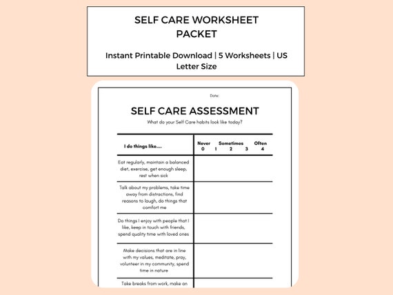 Self-Care Assessment Worksheet Self-Care Assessment Worksheet. This assessment tool provides an overview of effective strategies to maintain self-care. After completing the full. Self-Care Assessment Worksheet | AMHS-KFLA Self-Care Assessment Worksheet. This assessment tool provides an overview of effective strategies to maintain self-care. Using the scale below, ...
