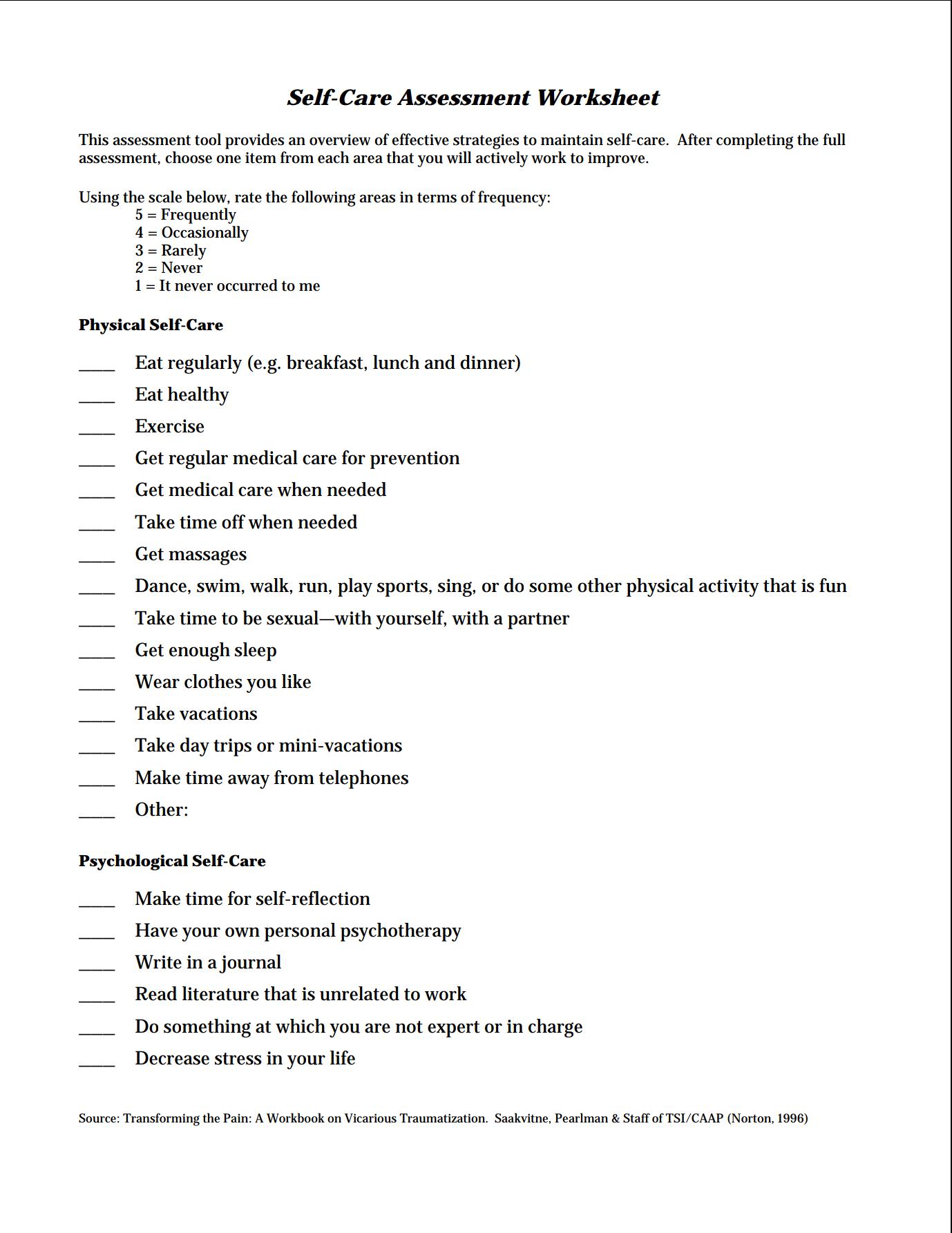 socialwork.buffalo.edu › self-care-assessmentSelf-Care Assessment - University at Buffalo Self-Care Assessment Adapted from Saakvitne, Pearlman, & Staff of TSI/CAAP (1996). Transforming the pain: A workbook on vicarious traumatization. Norton. The following worksheet for assessing self-care is not exhaustive, merely suggestive. Feel free to add areas of self-care that are relevant for you and rate yourself on how often and