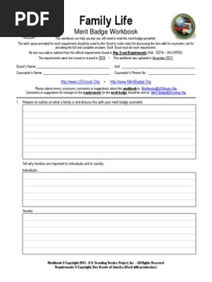 PDF Merit Badge Workbook - USSCOUTS.ORG No one can add or subtract from the Boy Scout Requirements #33215. Merit Badge Workbooks and much more are below: Online Resources. Worksheet developer: craig@craiglincoln.com. Requirements revised: 2005, Workbook updated: August 2008. ... Family Life p. 2 Merit Badge Workbook Scout's Name: _____ ...