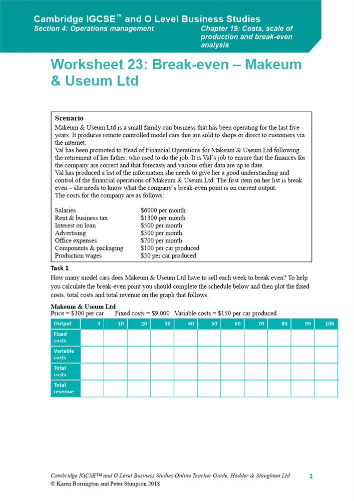 Costs of production worksheet