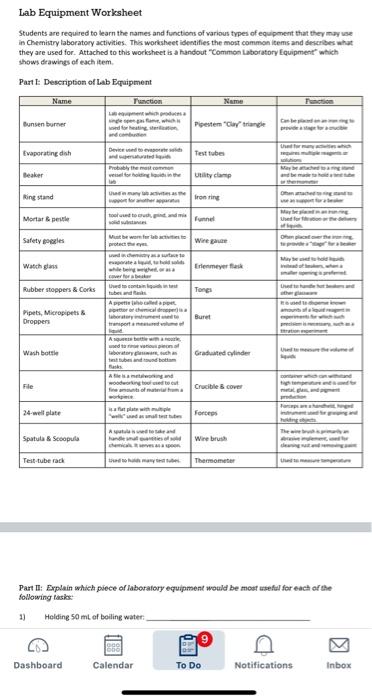 Lab equipment names worksheet answers. Lab Equipment Worksheet - Answers.pdf - Course Hero grade 10 science miss miller visual name function triple beam balance for measuring mass thermometer for measuring temperature test tube for measuring and pouring liquids; for heating or mixing substances spring scale for measuring weight (or force) test tube holder for holding an individual test tube a - beaker b -florence flask c -erlenmeyer … Common Laboratory Equipment Worksheet Answers Lab Equipment Worksheet Teaching Resources. Results 25 - 48 of 1071 ... This product gives you a worksheet of many common lab equipment and 5 Quizzes with answers. This is a great opportunity to test your ... DOC WORKSHEET - Lab Equipment - Liberty Union High School District WORKSHEET - Lab Equipment A number of items you will be using in the laboratory are shown below. Study this page and decide what the items may be used for, then, match the correct equipment pictured on this page to the tasks asked for on the bottom of the page. Lab Equipment Worksheet Answers - Imsyaf Feb 28, 2022 · Lab Equipment Worksheet Answers February 28, 2022 admin Small analysis tubes and a analysis tube rack 1-2 pieces of zinc pellets 1-2 pieces of advance shot 1-2 pieces of aluminum attempt (aluminum antithesis discouraged) 1 baby band of magnesium ribbon Any added metals that are calmly attainable (e.g., chestnut wire, an adamant nail, etc.)