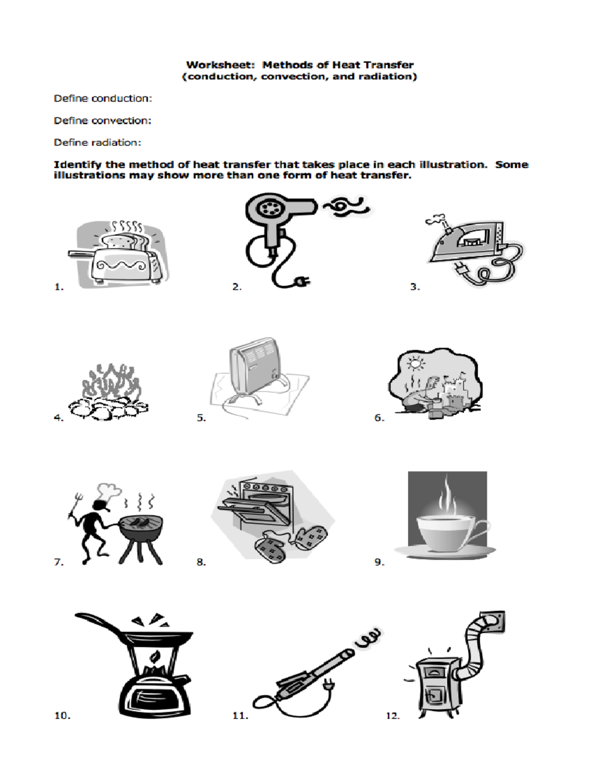 Heat transfer worksheets and online exercises Heat transfer worksheets and online activities. Free interactive exercises to practice online or download as pdf to print. Methods_of_Heat_Transfer - Worksheet: Methods of Heat... - Course Hero Worksheet: Methods of Heat Transfer (conduction, convection, and radiation) Define conduction: Define convection: Define radiation: Identify the method of heat transfer that takes place in each illustration. Some illustrations may show more than one form of heat transfer. 1. 2. 3. 4. Methods Of Heat Transfer Worksheets - K12 Workbook *Click on Open button to open and print to worksheet. 1. Worksheet: Methods of Heat Transfer (conduction ... ReloadOpenDownload 2. Methods Of Heat Transfer Worksheet - ReloadOpenDownload 3. Worksheet: Methods of Heat Transfer (conduction ... ReloadOpenDownload 4. Worksheet: Methods of Heat Transfer (conduction ... ReloadOpenDownload 5. Method Of Heat Transfer Worksheet Answer Key PDF Worksheet: Methods Of Heat Transfer (conduction, Convection, And Radiation) In each of the following situations, identify the method of heat transfer taking place (conduction, convection, radiation). More than one process may be occurring. 1. Hot coffee is stirred with a spoon, the spoon gets hot due to _____. 2.