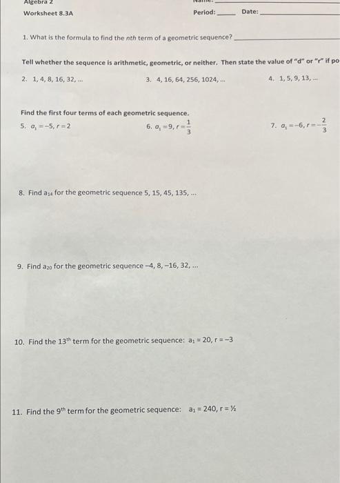 Geometric sequence worksheet answers. Arithmetic and geometric sequences worksheet ( with answer key + pdf ... Arithmetic and geometric sequences worksheet ( with answer key + pdf) October 4, 2022 by Mathematical Worksheets A sequence is an ordered list of items in mathematics (or events). It, like a set, has members (also called elements or terms). The length of the sequence is defined as the number of ordered items (which might be infinite). Arithmetic Sequence Maze Worksheet With Answers Step Displaying top worksheets found for arithmetic and geometric sequences algebra. Arithmetic sequence word problems worksheet answers problem worksheets sequences. Is an award winning math learning program used by more than million kids for fun math practice. Arithmetic Sequences Maze Algebra 1 Worksheets. GCSE Geometric Sequences Questions and Answers - PiAcademy Tutors GCSE Geometric Sequences Questions and Answers. GCSE Solved Topic Wise Questions. 5,000+ Topicwise Questions & Answers Included. Best for 11+ Grammar & Independent School Exams. Improve Speed, Accuracy & Time Management. PDF Geometric Sequences - Effortless Math Given the recursive formula for a geometric sequence find the common ratio, the first five terms, and the explicit formula. 7) 𝑛= n - 1.2, 1=2 8) 𝑛=an−1.−3, 1=−3 9) 𝑛= n - 1.5,a1=2 10) 𝑛= n - 1.3,a1= −3 Given two terms in a geometric sequence find the 8th term and the recursive formula.