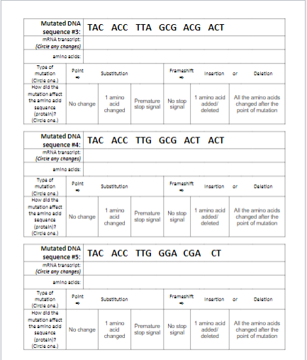 DNA Mutations Practice Worksheet DIRECTIONS: | Chegg.com Science. Biology. Biology questions and answers. DNA Mutations Practice Worksheet DIRECTIONS: Transcribe and translate the original DNA sequence. Then, do the same for each mutated DNA sequence. Then, determine the consequence, if any, for each mutation, by circling your choice for each question. You will need a Genetic Code Chart.