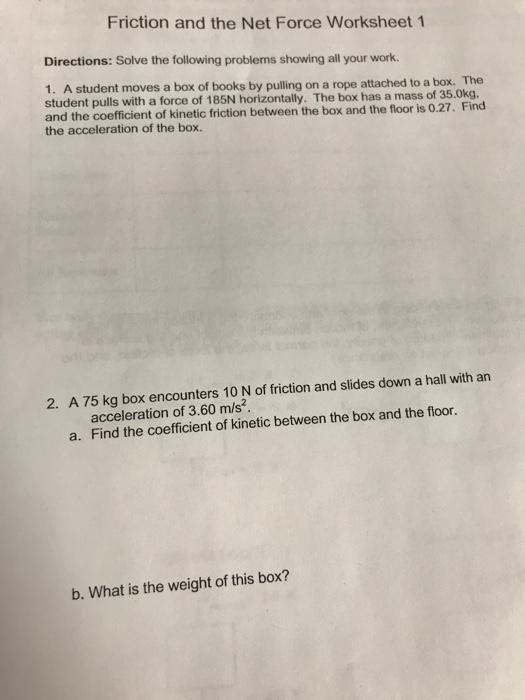 Net force worksheet answers. DOC Practice Worksheet: Net Forces and Acceleration - Obion County Schools Practice Worksheet: Net Forces and Acceleration Net Force and Acceleration Practice For each of the following problems, give the net force and the direction on the block. 1) Net Force = ______________ Direction = ______________ 2) Net Force = ______________ Direction = ______________ 3) Net Force Problems Revisited - Physics Classroom The net force is 69.9 N, right and the acceleration is 3.5 m/s/s, right. Note that the vertical forces balance but the horizontal forces do not. The net force is ... Try each problem and then click the button to view the answers. 1. A 50-N applied force (30 degrees to the horizontal) accelerates a box across a horizontal sheet of ice (see ... Net Force Calculation Answers Worksheets - K12 Workbook Net Force Calculation Answers Displaying all worksheets related to - Net Force Calculation Answers. Worksheets are Calculating net forces, Work 1 body or force diagrams, Fma work, Physics work solutions, Speed velocity and acceleration calculations work, Vector work, Exercises on force and motion exercise i, Forces newtons laws of motion. Momentum and Collisions Review - with Answers - Physics … WebAnswer: BE. a. FALSE - No. Momentum is momentum and energy is energy. Momentum is NOT a form of energy; it is simply a quantity which proves to be useful in the analysis of situations involving forces and impulses.. b. TRUE - If an object has momentum, then it is moving. If it is moving, then it has kinetic energy. And if an object has kinetic energy, then …