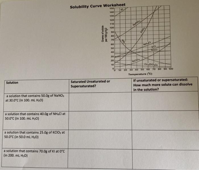 Solubility Curves Worksheet Teaching Resources | TPT - TeachersPayTeachers A detailed answer key is included.This product includes 16 problems covering:Determining Amount of Solute Dissolved Given TemperatureDetermining Temperature Given Amount of Solute DissolvedDetermining Amount of Solute Dissolved in a Different Amount of WaterIdentifying a Solution as Saturated, Unsaturated, or Supersaturate Subjects: